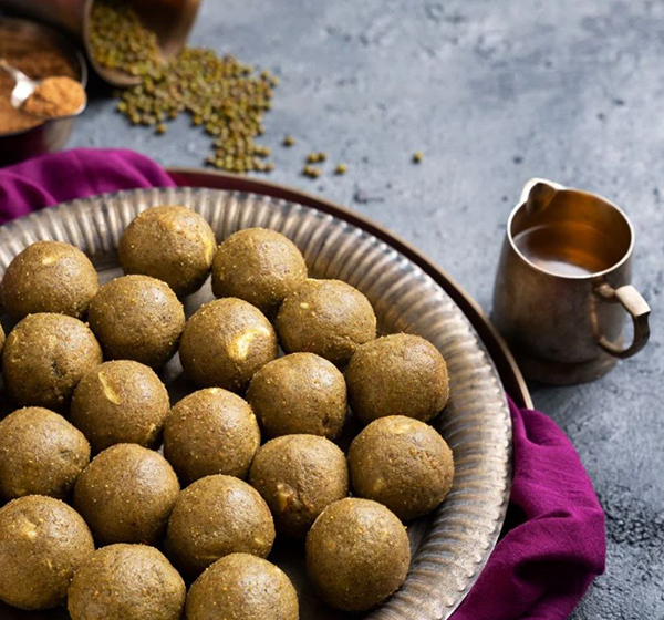 Roasted Whole Green Gram (Moong), Jaggery, Ghee.